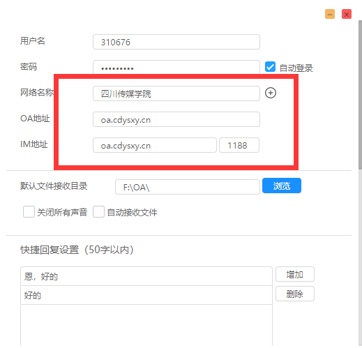 客户端登录前需按下图设置网络环境:OA地址设置为oa.cdysxy.cn | ||