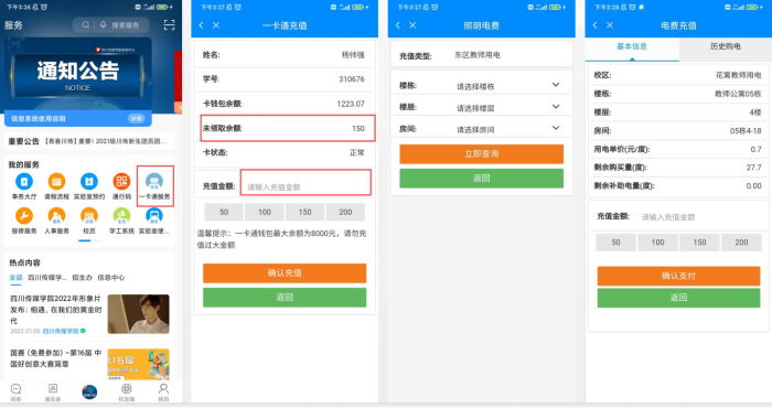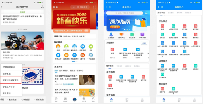智慧川传App是学校的移动端应用平台,目前集成的服务有人事系统、教务系统、OA系统、学工系统、宿管系统、网上办事大厅、网上报修、校历查询、课表查询、实验室使用预约、一卡通服务等模块。教职工关注四川传媒学院微信公众号,可获取“智慧川传”App下载链接,登录账号密码来源于统一身份认证平台。